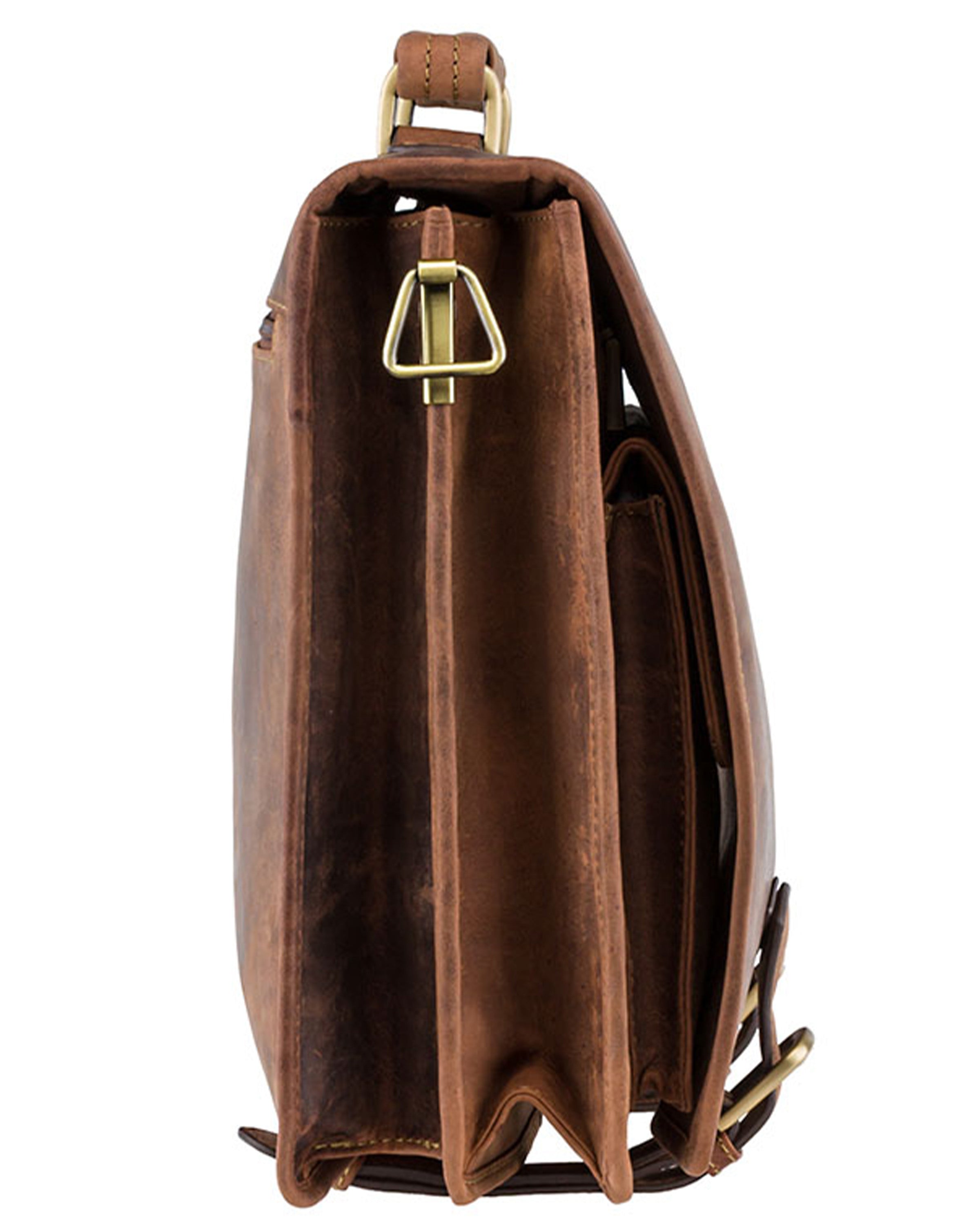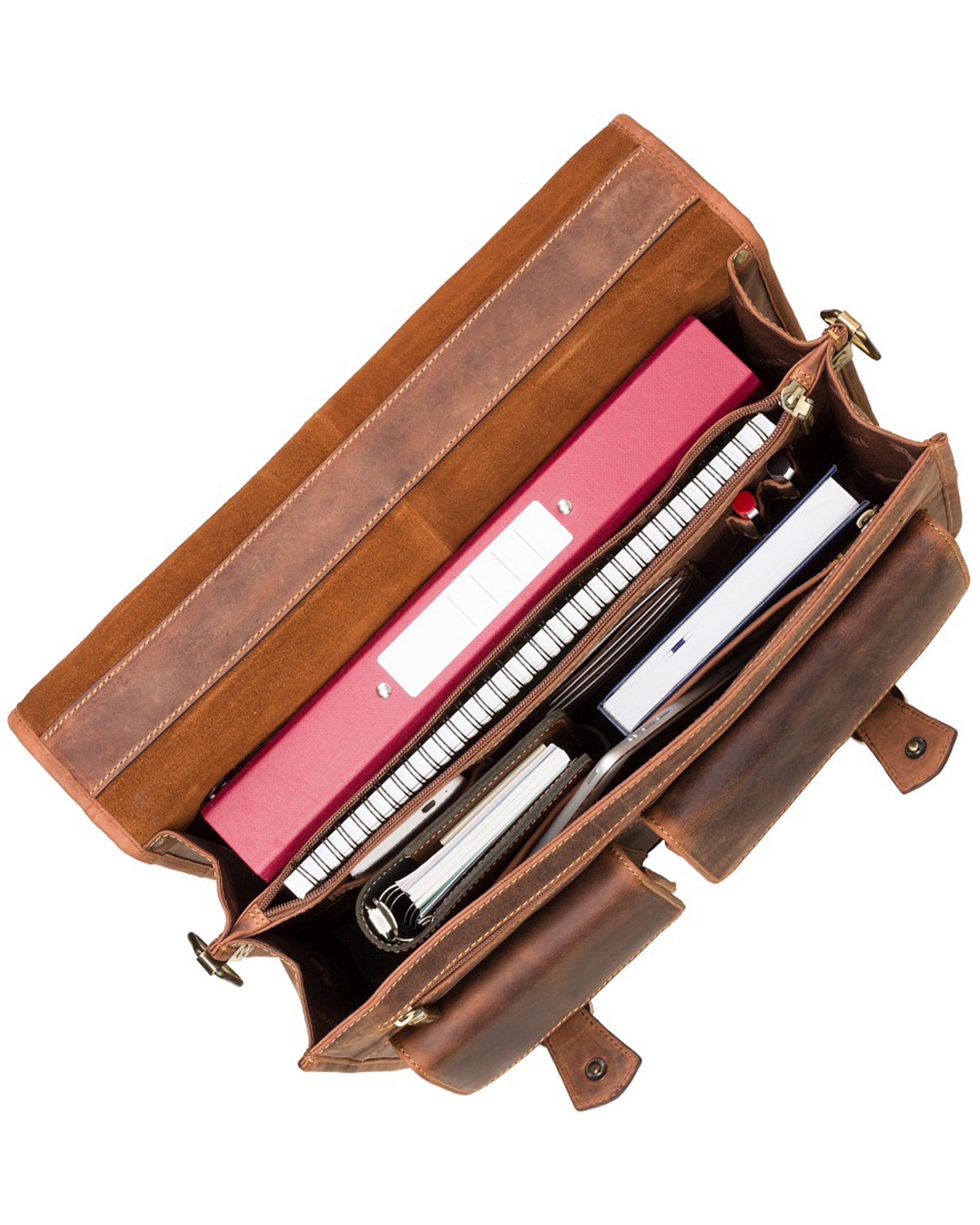 This large multi compartment briefcase is made with natural tan leather. With its substantial amount of pockets and compartments this model allows you to carry a heavy workload in an organised fashion.