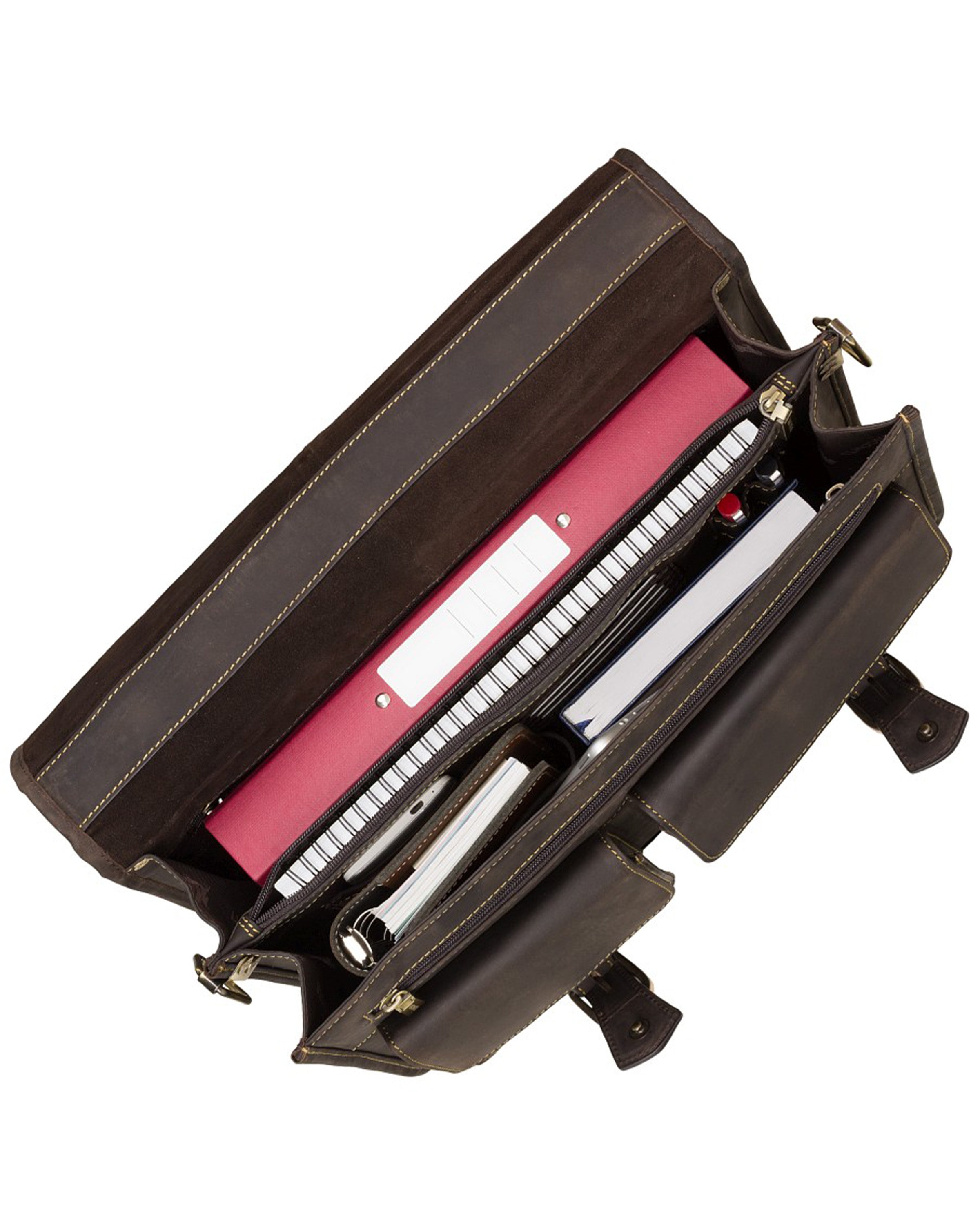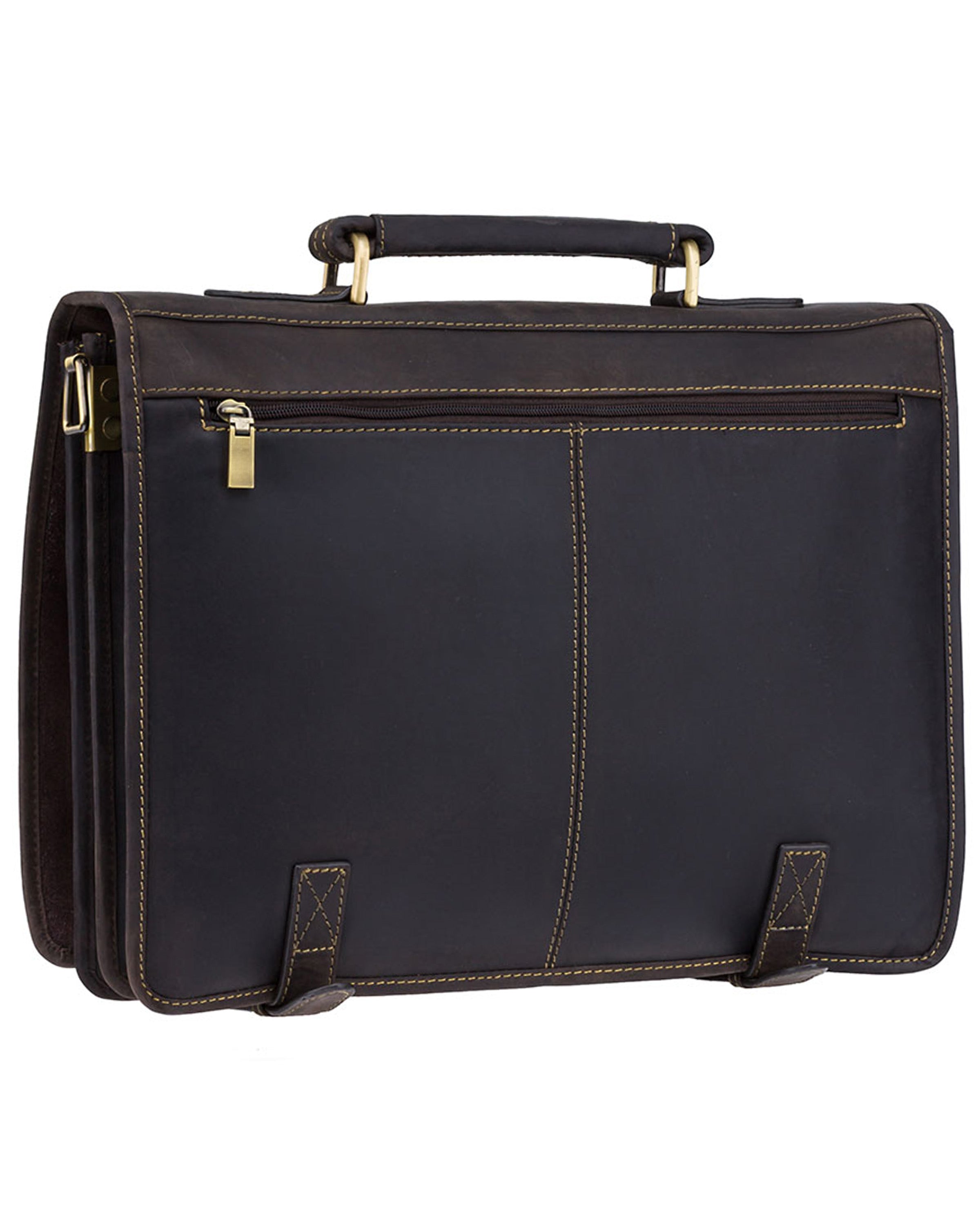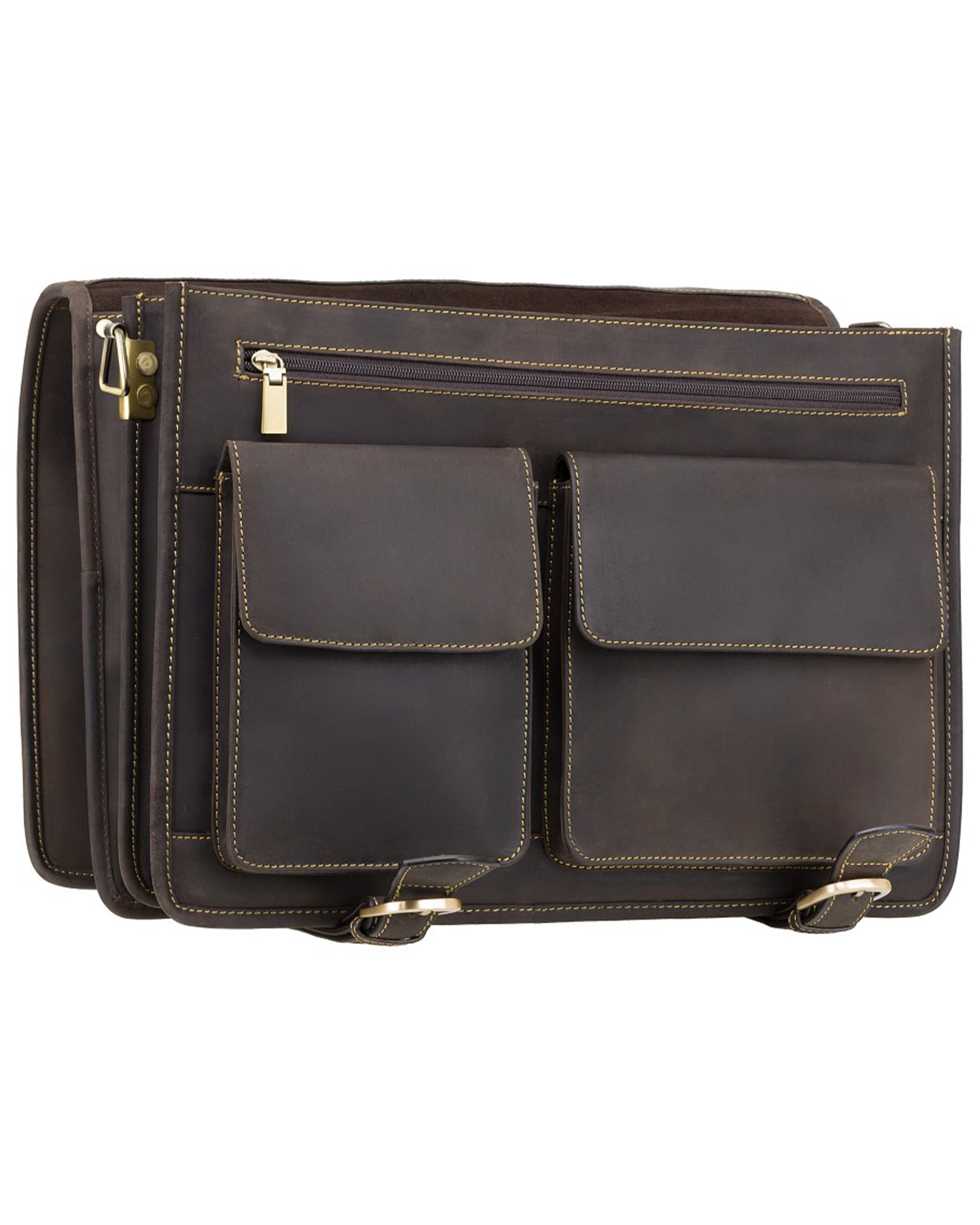 This large multi compartment briefcase is made with natural tan leather. With its substantial amount of pockets and compartments this model allows you to carry a heavy workload in an organised fashion.